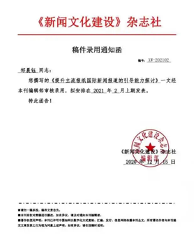 独立在国家级《新闻文化建设》期刊中发表题为《提升主流报纸国际新闻报道的引导能力探讨》