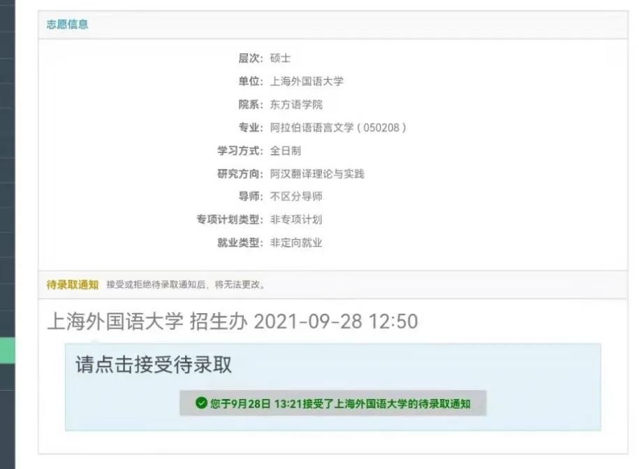 目前已推免至上海外国语大学阿拉伯语语言文学方向。