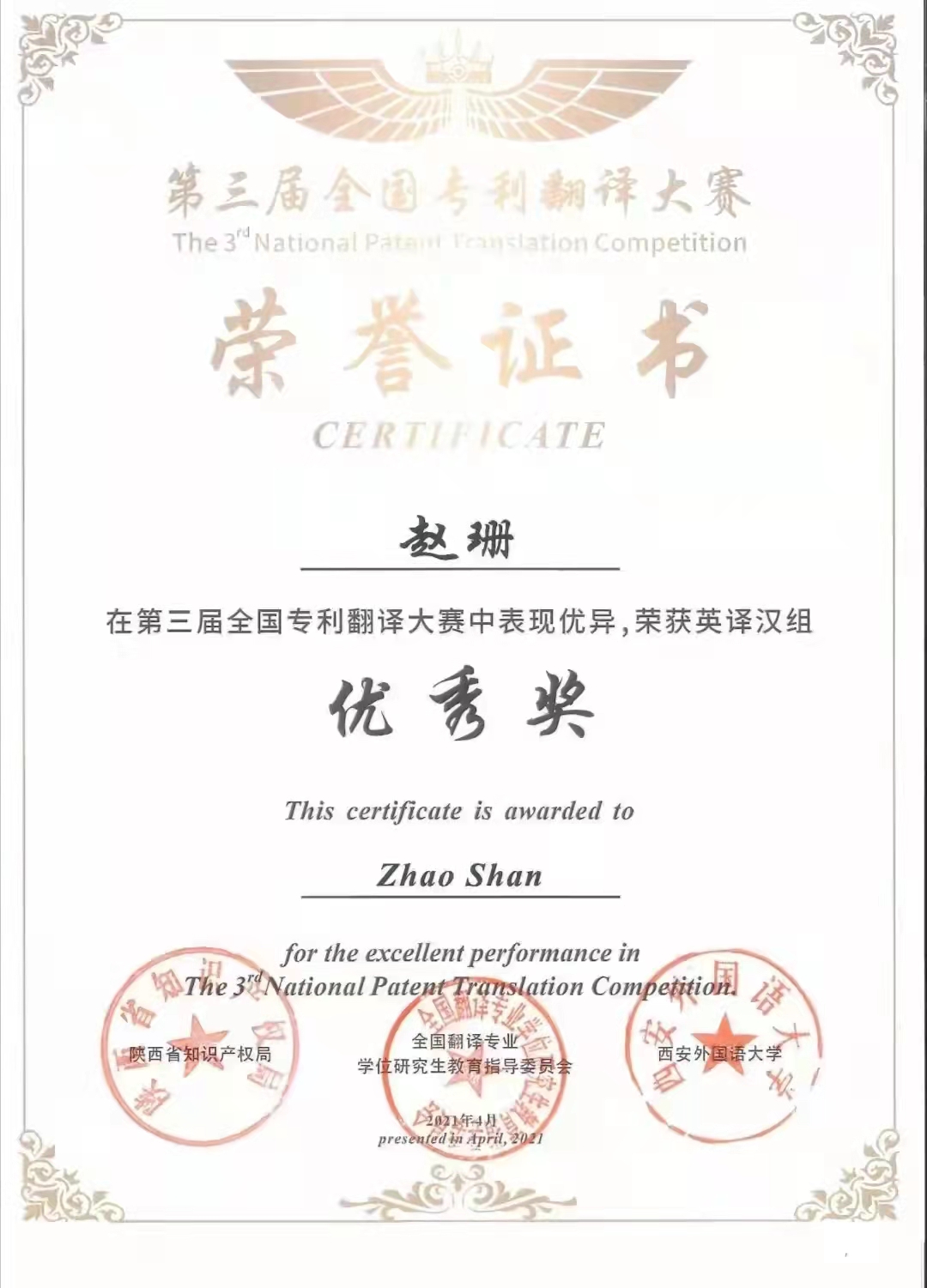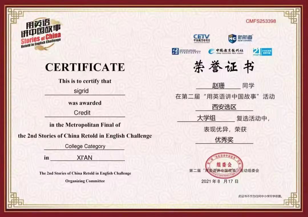 第二届“用英语讲中国故事”西安选区大学组优秀奖