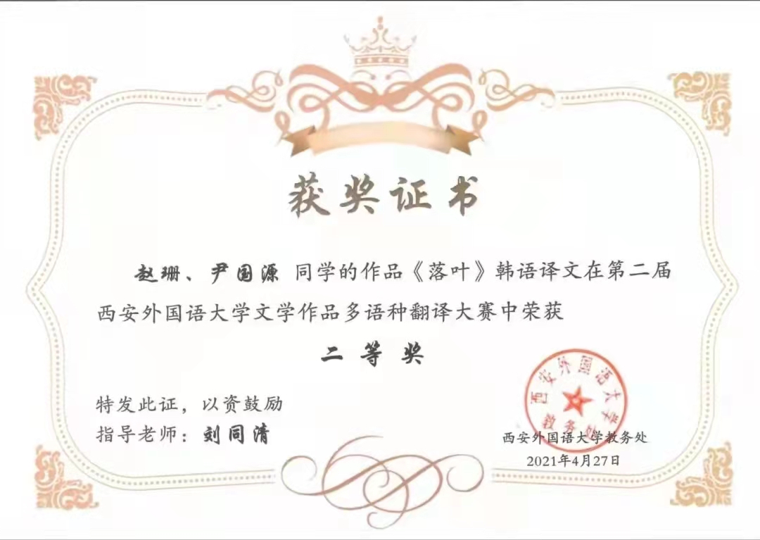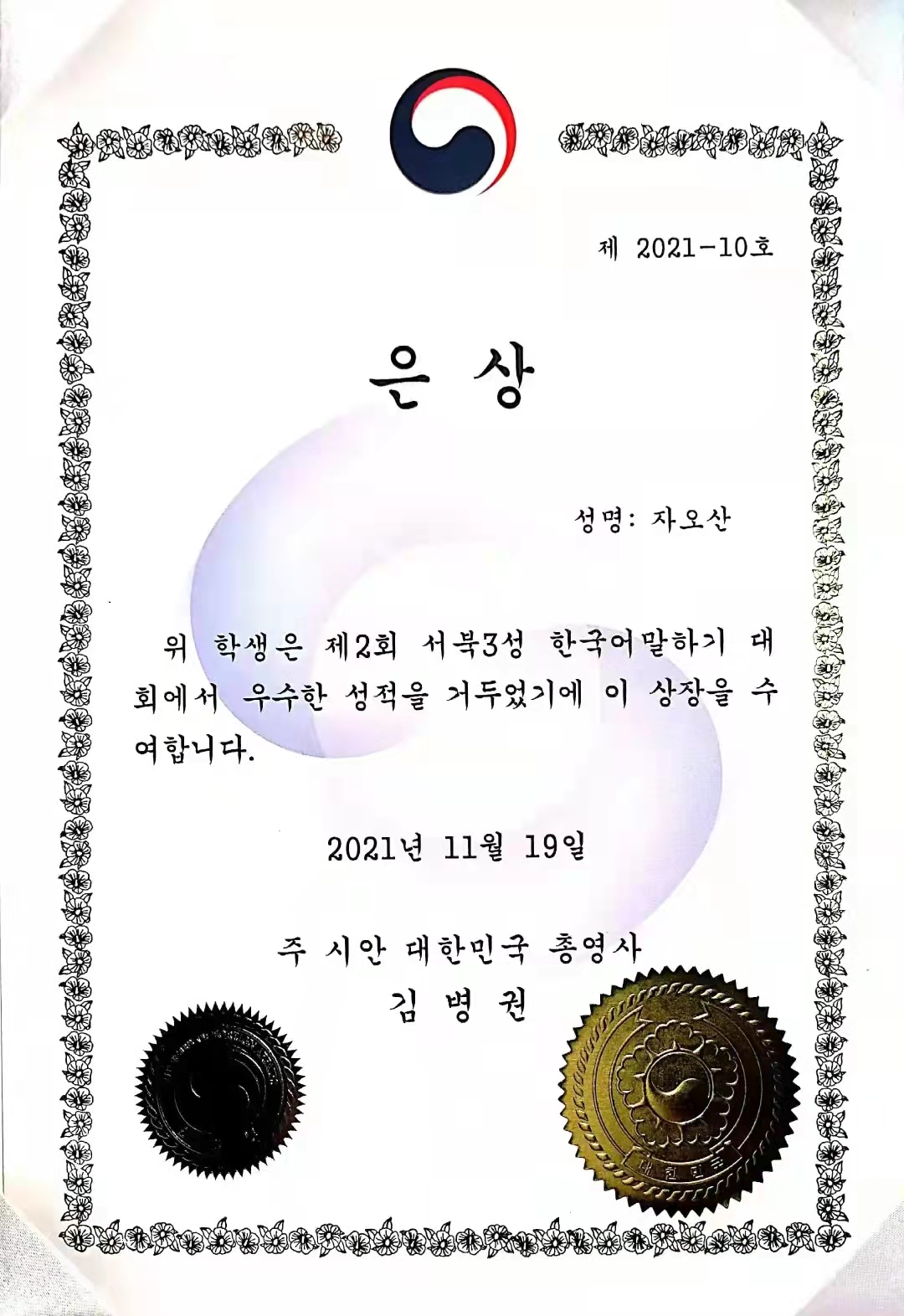 第二届总领事杯西北三省韩国语演讲大赛银奖
