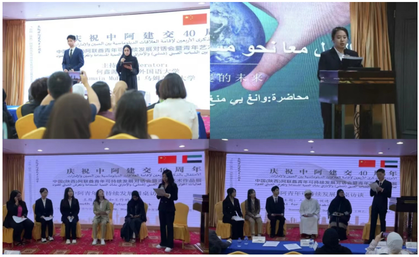 我校学生何鑫源、韩仁杰分别做了“中国为可持续发展实施的绿色方案”“中国数字智能助力可持续发展”的主旨报告;中阿青年友好大使、沙迦大学学生玛杜琳和阿里·努艾米及乌姆盖万大学学生阿伊莎喀特比分别做了“面向可持续发展的阿联酋—中国关系”、“绘制绿色丝绸之路”、“中阿青年赋权对可持续发展的重要性”的报告;西安美术学院教师白茜向大家分享了“艺术为人民——西美的使命与初心”;乌姆盖万大学学生瓦里叶娃、我校学生王丹琦、王艺萌分别做了“教育是可持续发展的基石”、“青年如何为可持续发展赋能”、“教育可持续发展的未来”的主旨报告。