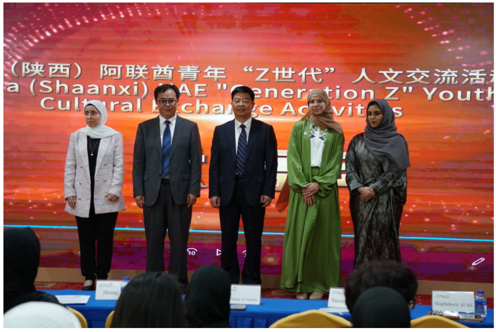 中国与阿拉伯青年友好大使玛杜琳·阿里代表阿联酋一方致辞。她表示,中阿青年应传承友好,加强文化交流,携手应对挑战,共同创造更加繁荣、公平的未来。张琳在致辞中表示,中阿两国的友好关系需要一代又一代有志、有为青年传承和发扬。此次对话活动,既是对古丝绸之路精神的传承发扬,也是共建“一带一路”的生动实践。相信有两国人民,特别是青年朋友的共同支持和参与,一定能够创造两国合作共赢新历史,共同迈向中阿更加美好的未来。马福德院长以唐朝中阿交往的典型事例,生动阐释中阿友好历史关系。他表示青年是民族的未来和希望,青年强,则国家强;青年友好,则世界友好。苏桑·沙欣博士以“打破界限—为可持续发展的世界而创新”为主题,分享乌姆盖万大学在环境治理方面的创新项目。她鼓励双方青年要放眼世界,加强合作,为创建美丽世界而努力。期间,双方领导嘉宾还共同启动“庆祝中阿建交40周年—中国(陕西)阿联酋青年‘Z世代’人文交流系列活动”。