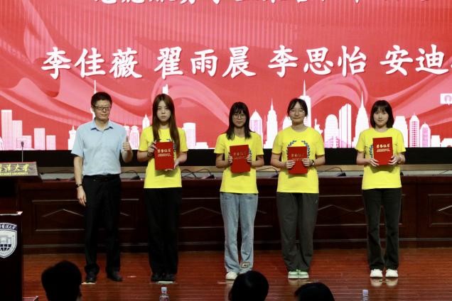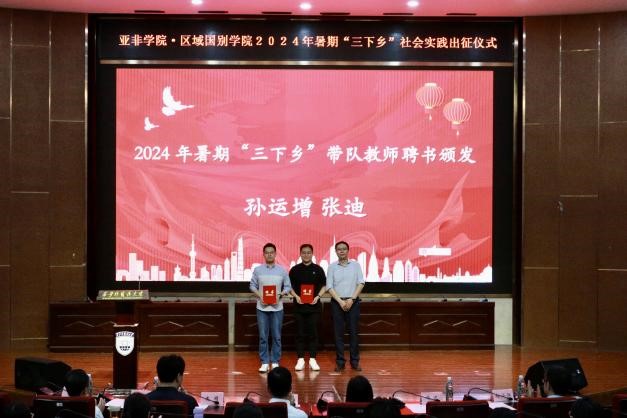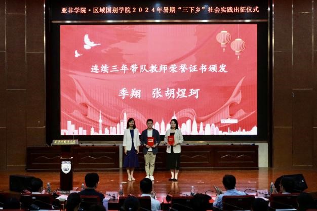 2024年暑期“三下乡”社会实践队伍的通知》。带队教师代表孙运增、学生代表翟雨晨和陆肖璞玉分别进行发言,他们表示将以饱满的热情和高度的责任感投入到志愿服务活动中,严格按照计划开展工作,保质保量完成各项工作任务。在表彰环节,与会领导为调研指导教师张少丹、带队教师孙运增、张迪颁发聘书;为连续三年带队教师季翔、张胡煜珂颁发荣誉证书;为连续两年参与暑期“三下乡”志愿服务学生代表颁发荣誉证书。