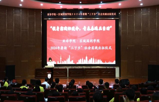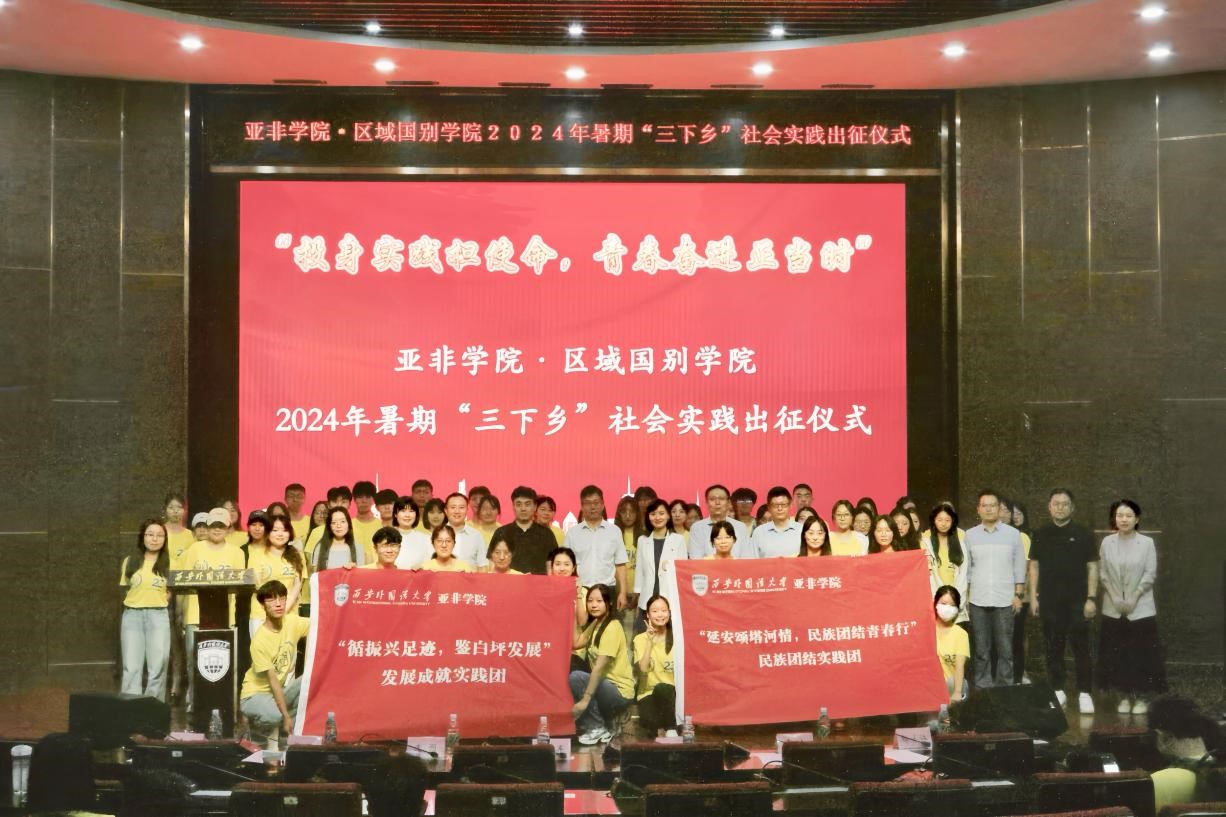 2024年暑期“三下乡”社会实践出征仪式于7月5日在长安校区SA105模联实验室举行。学校副校长姜亚军、教务处处长庞闻、校团委书记王娜、乡村振兴办公室主任冯达、学工部副部长、就业指导中心主任杨小江、肉漫
