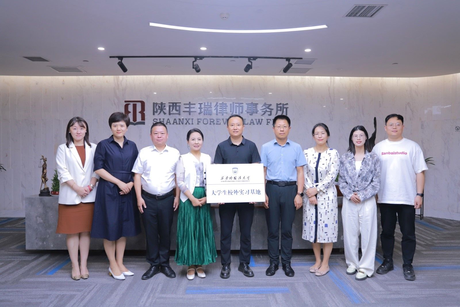 一行在律所人员的引导下参观了丰瑞律所,了解律所业务特色。在座谈交流环节,双方围绕多个主题展开讨论,明确未来合作方向,达成多项共识: 一是加强课程共建,联合开发法律与外语交叉相关课程;二是加强交流互访,促进各项工作落地,三是搭建平台,共同开展涉外法律服务业务;四是为学生提供涉外法律等方面实习机会。 随后双方签订《共建大学生实习基地协议》,并共同为实习基地揭牌。