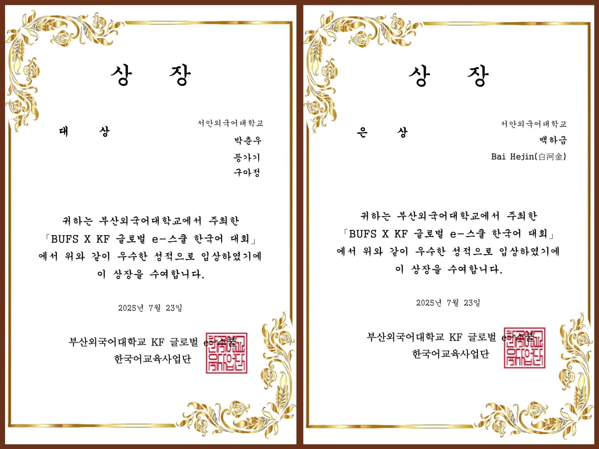 近日,2025“BUFS X KF全球e-课堂短视频大赛”获奖名单正式公布。经过激烈角逐,由我校朝鲜语专业童晓玲老师指导的朴春宇、邓家棋、寇雅婷团队凭借原创视频作品《一句话,不用的世界》,斩获本次大赛最高奖“大奖”,并获得50万韩元奖金;宋姣和吴海利老师共同指导的白河金同学,其作品《韩中假面》荣获银奖,并获得10万韩元奖金。