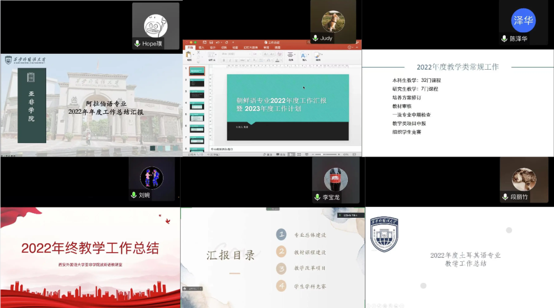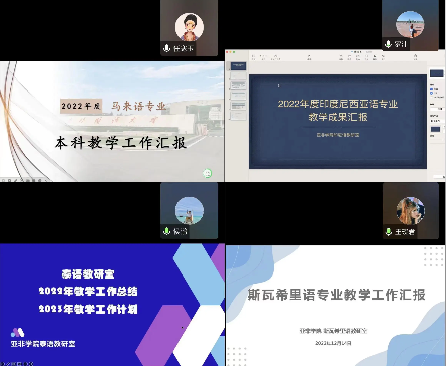 陈泽华副院长同时就一流专业建设及2023年本科教学重点工作进行了安排部署。他强调,2023年学院教学工作将重点关注以下几个方面:一是对标“十四五”核心指标,全面推进学院教学工作高质量发展;二是以一流专业建设为契机,全面推进学科、专业建设内涵式发展;三是实施核心任务项目制,明确责任分工,加大奖惩力度,全面激发教师潜能与活力。随后,阿拉伯语、朝鲜语、印地语、乌尔都语、波斯语、土耳其语、泰语、马来语、印尼语、斯瓦希里语10个专业对2022年度专业建设情况及2023年度教学工作安排依次进行汇报。
