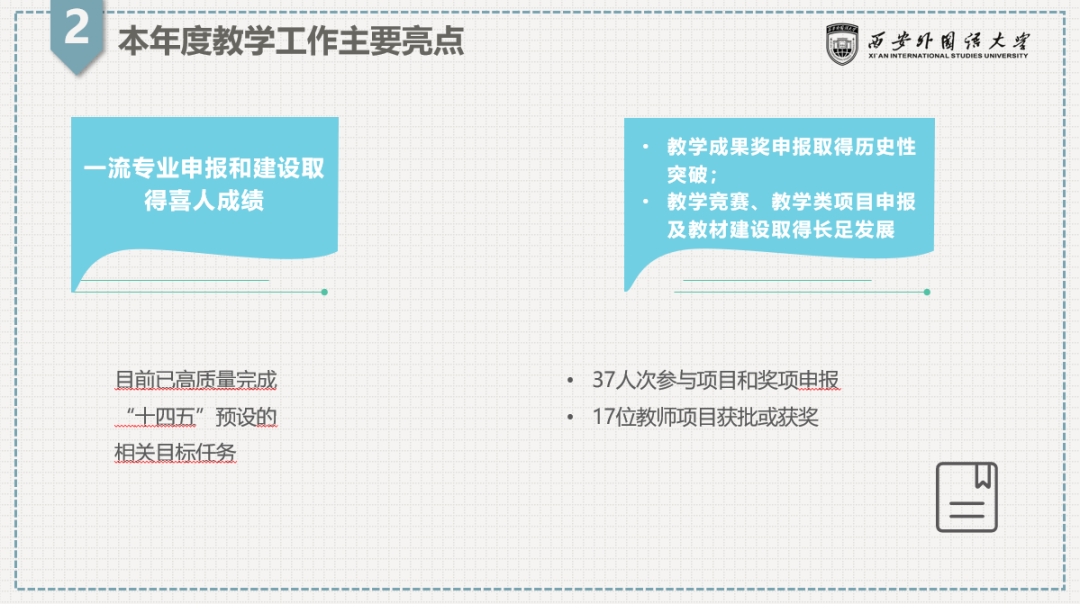 一是学院本年度常规教学工作开展良好,各专业线上、线下教学秩序井然,圆满完成培养方案修订、教材审查等教学工作;二是一流专业申报和建设取得喜人成绩,高质量完成学院“十四五”规划中的相关任务指标,本年度朝鲜语专业、乌尔都语专业获批国家级一流本科专业建设点,目前学院共有国家级一流专业4个(阿拉伯语、印地语、朝鲜语、乌尔都语),省级一流专业1个(波斯语),校级一流专业2个(土耳其语、马来语);三是教学成果奖申报取得历史性突破,教学竞赛、教学类项目申报及教材建设取得长足发展;四是学院全面稳步推进课程思政建设,“三进”教学工作取得一定成绩,学院在“思政大练兵”活动中表现优异。