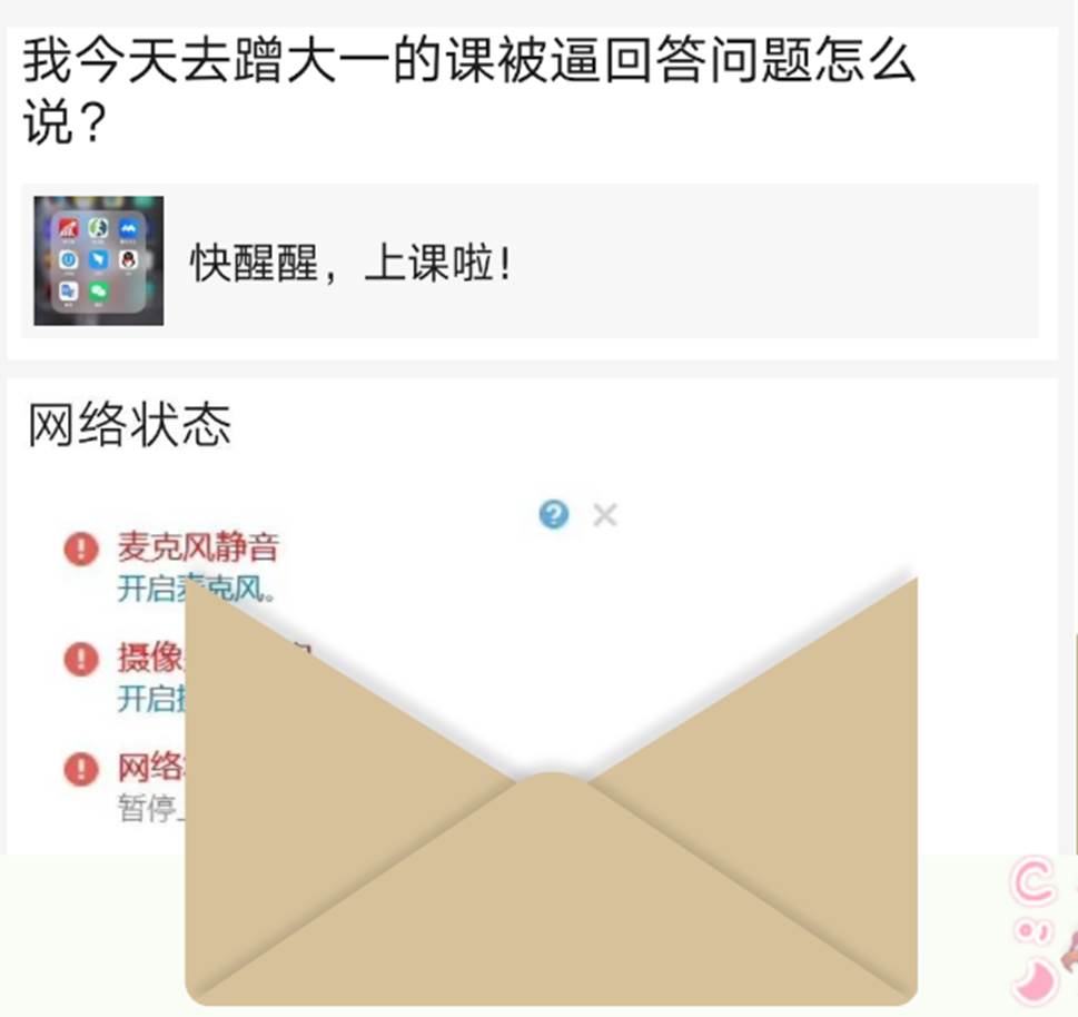 (哈哈哈)整体还不错,学生们都积极配合认真完成我所发出的一切学习指令。有些同学甚至比在实际课堂中还要更积极活泼地回答问题,不知道是不是因为看不见的关系,可以畅所欲言。总体来说,课程完整度还不错。